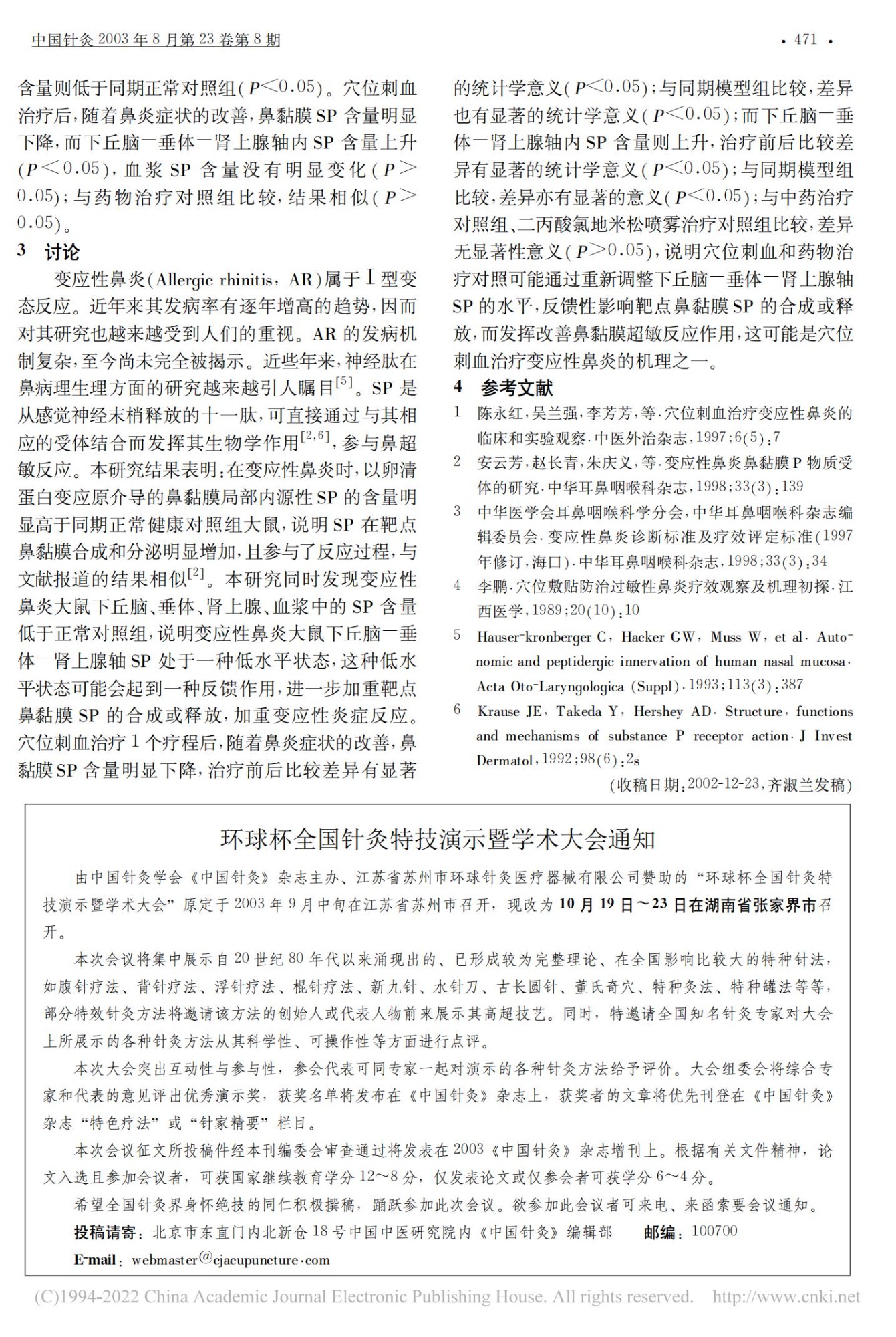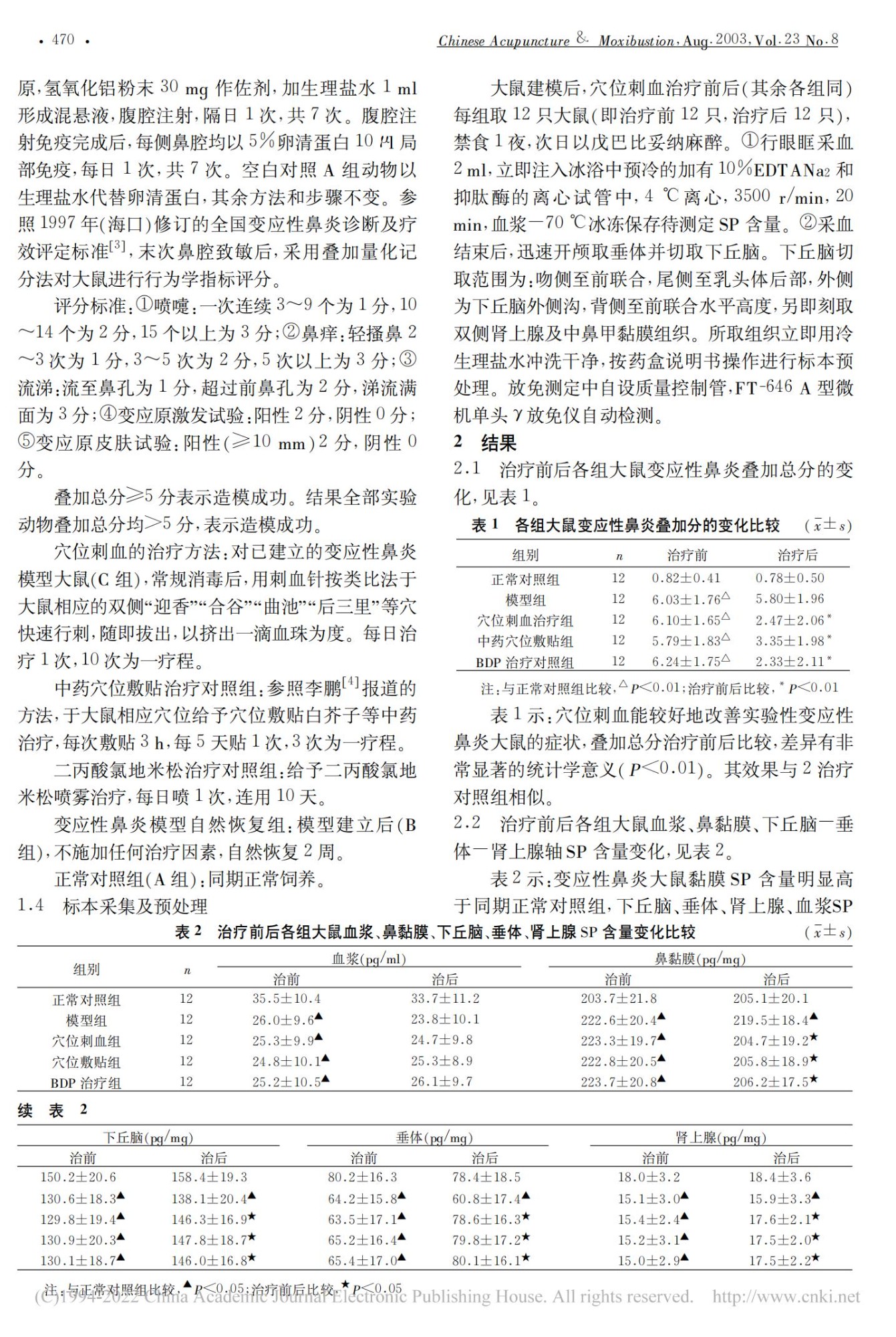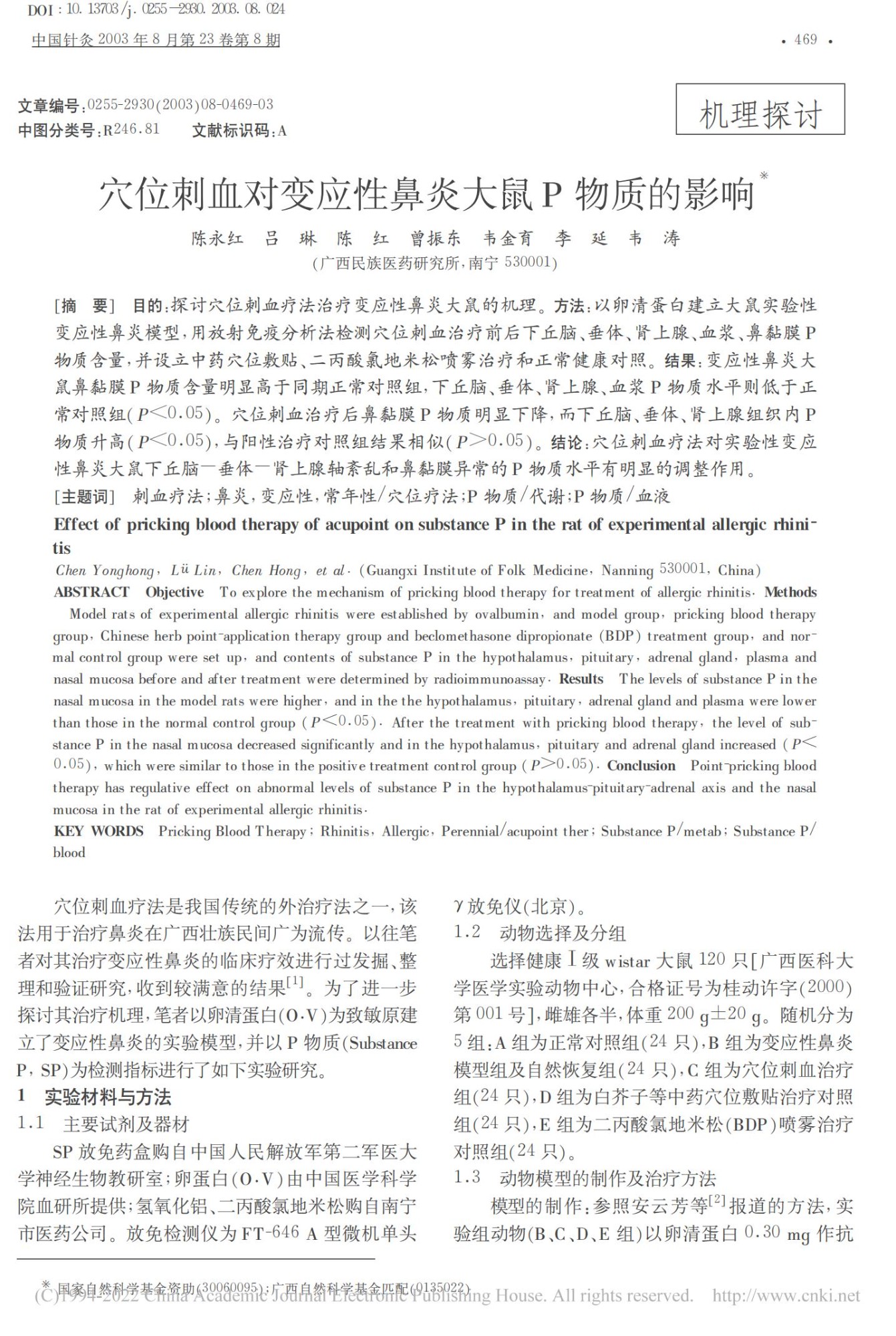 穴位刺血对变应性鼻炎大鼠 P 物质的影响