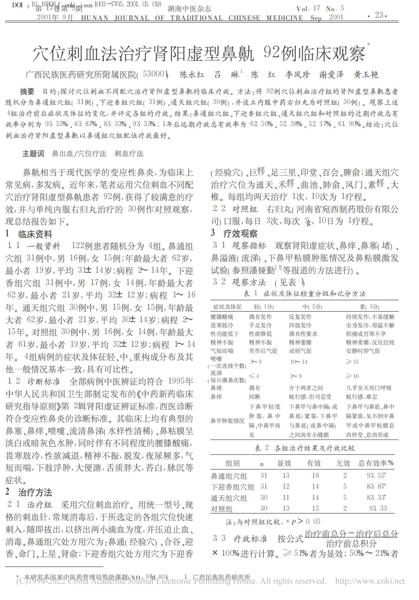 穴位刺血法治疗肾阳虚型鼻鼽 92例临床观察