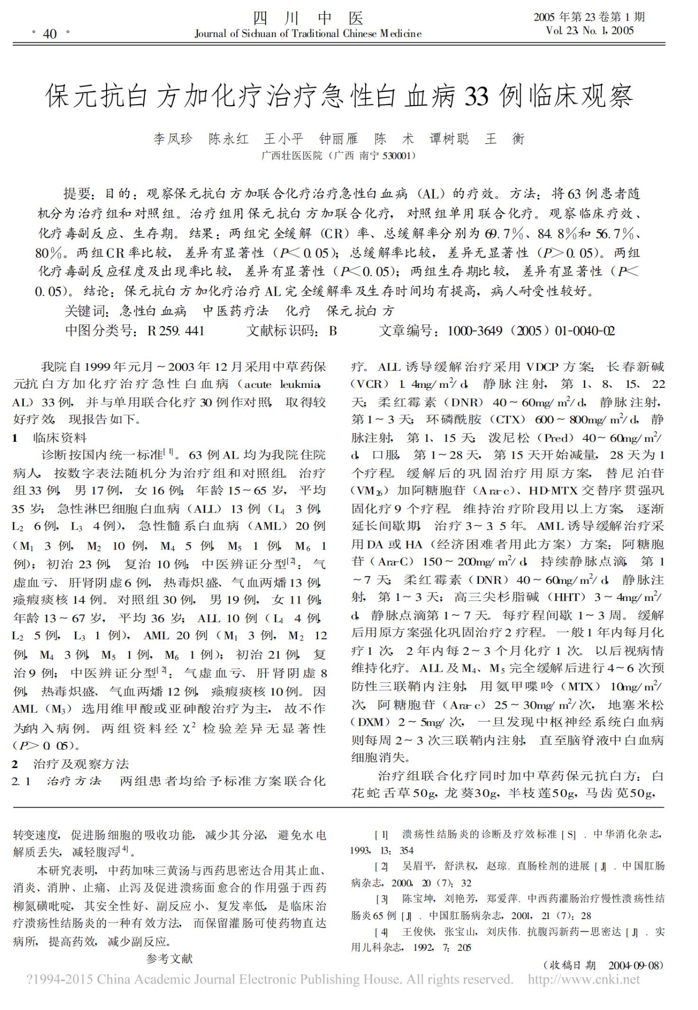 保元抗白方加化疗治疗急性白血病 33 例临床观察
