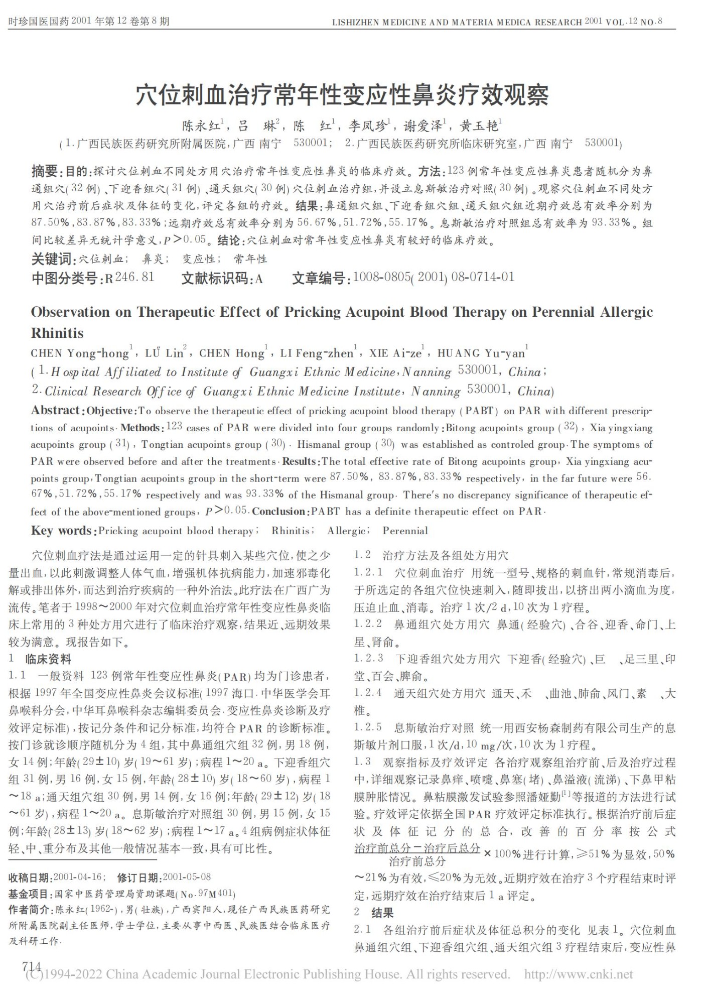 穴位刺血治疗常年性变应性鼻炎疗效观察