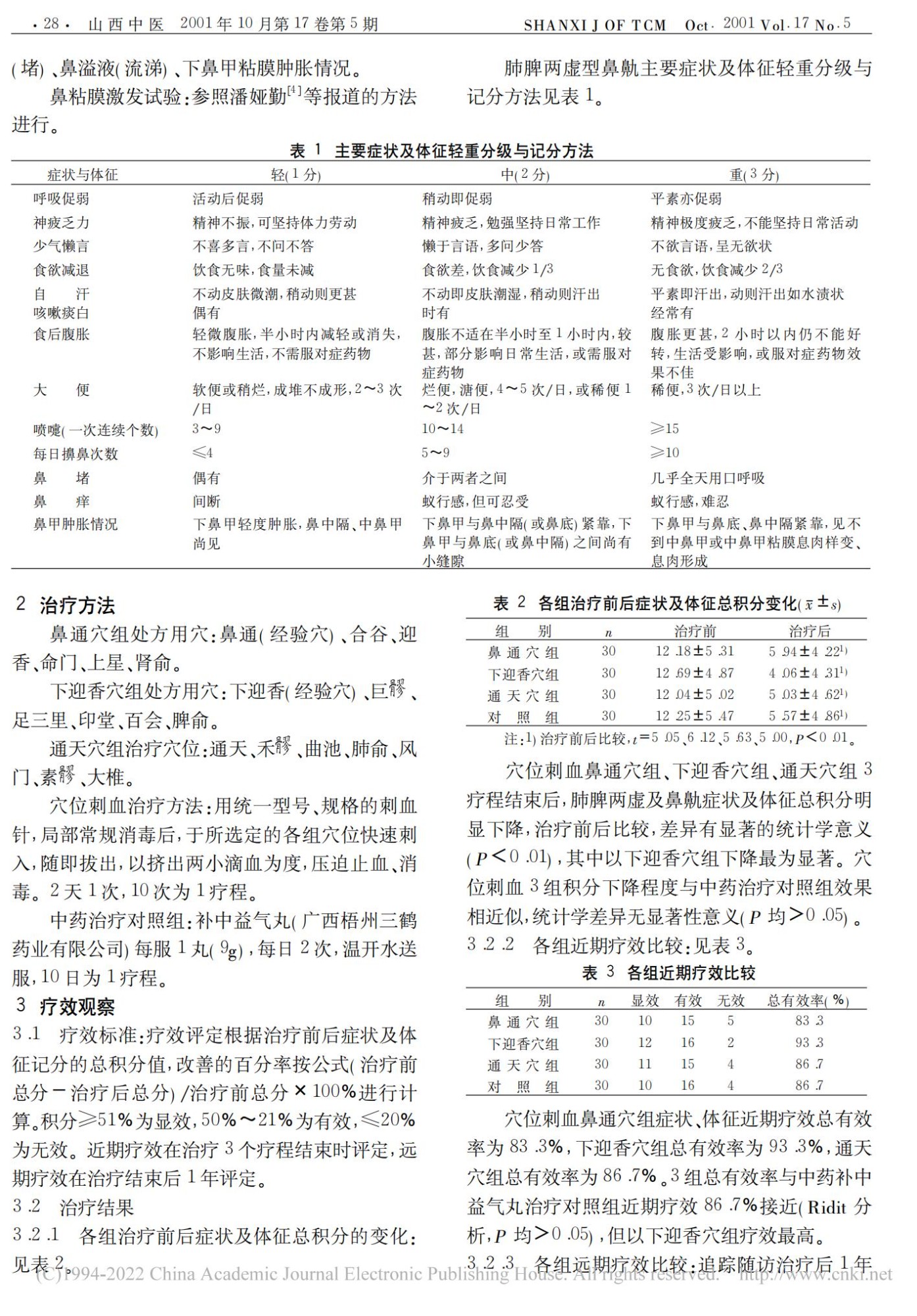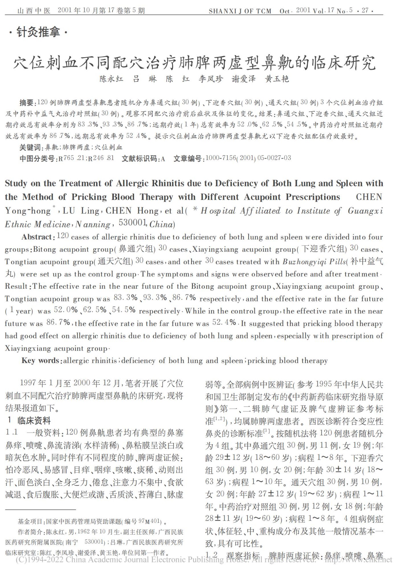 穴位刺血不同配穴治疗肺脾两虚型鼻鼽的临床研究