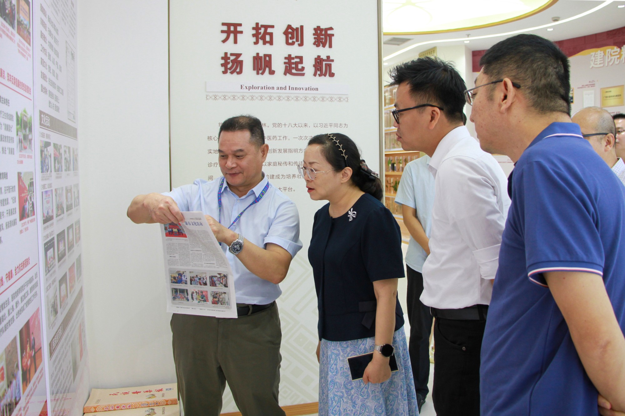 黄国东(左二)向陆静(左三)介绍壮医药标本