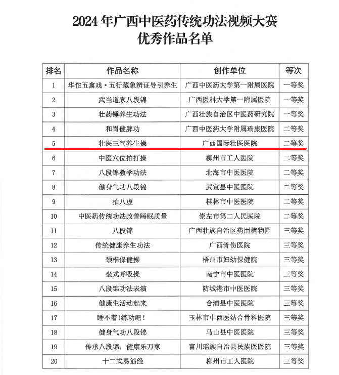 近日,由广西壮族自治区卫生健康委员会、自治区中医药局主办的2024年广西中医药传统功法视频大赛中,广西国际壮医医院参赛作品《壮医三气养生操》荣获二等奖。